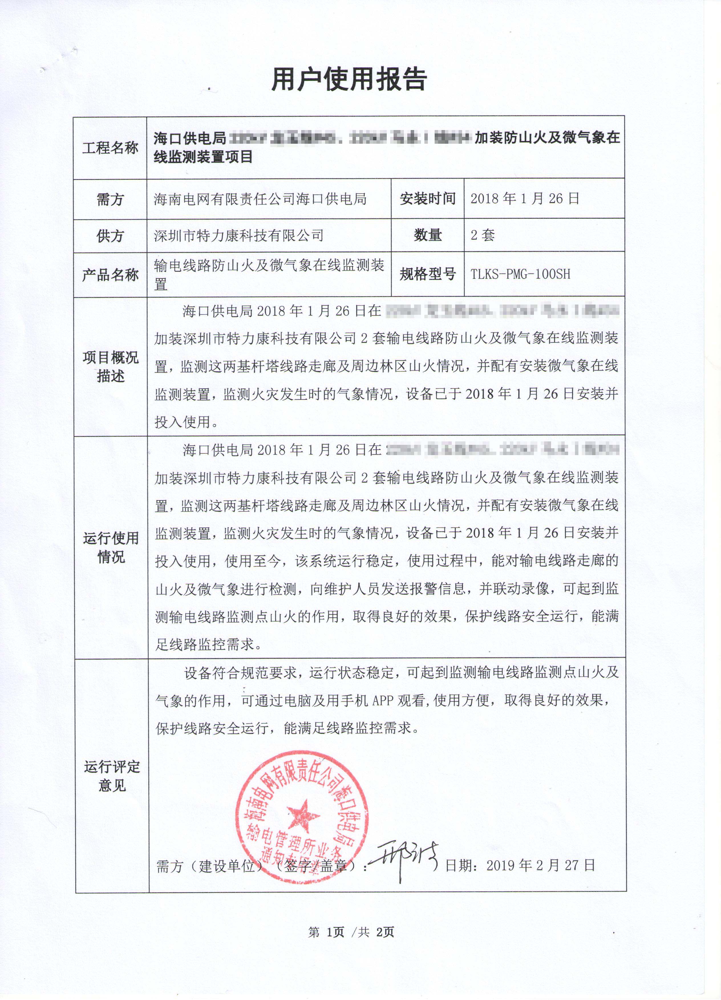 2018年1月26日海口供電單位在轄區管理線路安裝我司(深圳市特力康科技有限公司)輸電線路防外破裝置,該裝置應局方要求加裝了微氣象監測裝置及防山火裝置,監測塔桿線路走廊以及周邊森林區域山火情況。