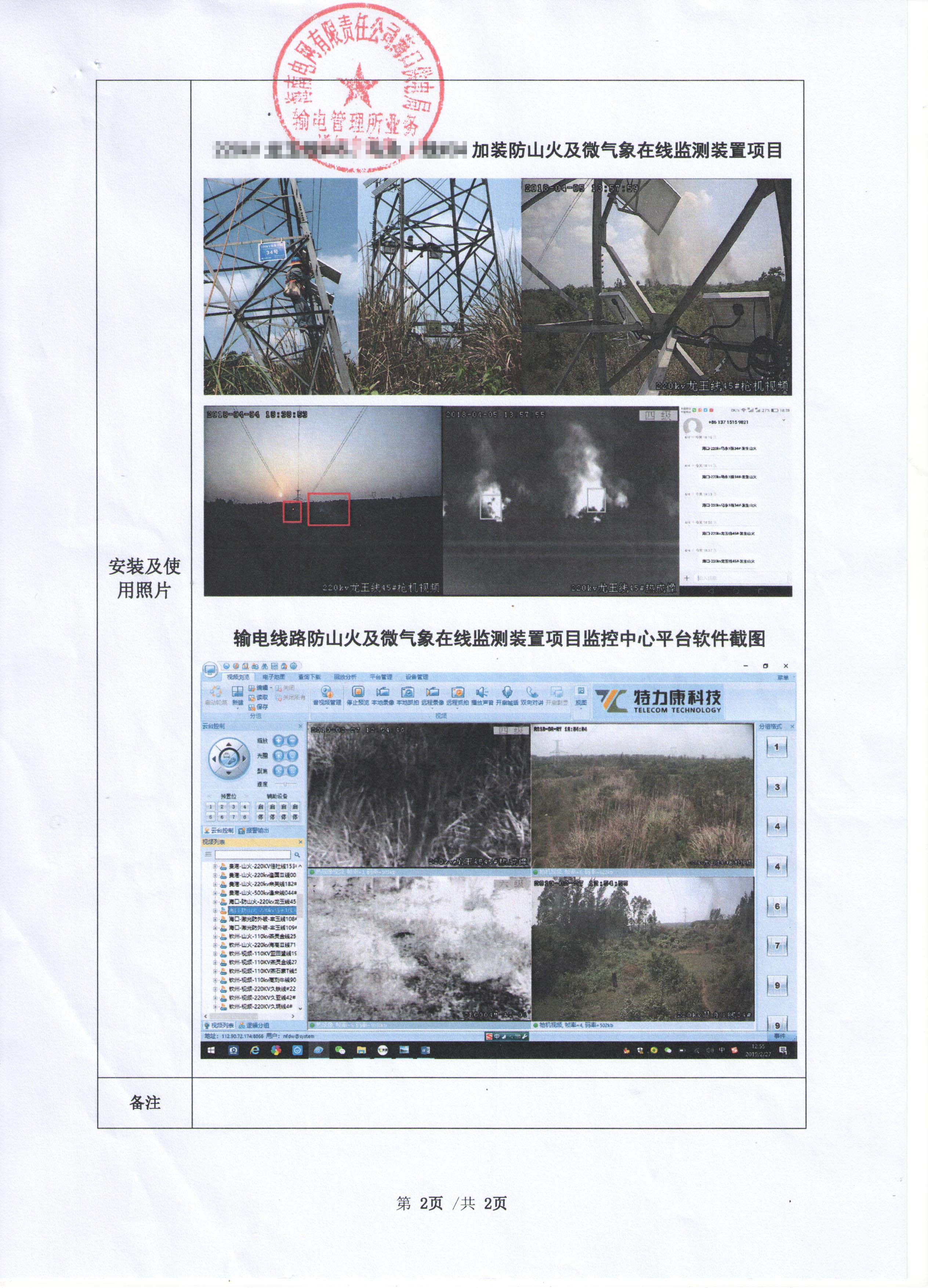 設備于2018年1月26日安裝并投入使用,使用至今,該設備及系統運行穩定,在使用過程中,設備能對輸電線路走廊山火及微氣象進行監測,及時向維護人員發送報警信息,并聯動錄像裝置,可以很好的監測輸電線路山火及微氣象。