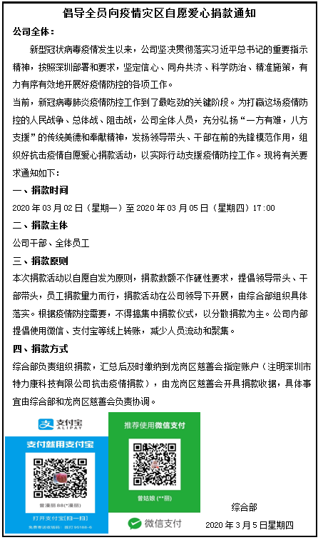 在公司層領(lǐng)導(dǎo)的帶領(lǐng)下,特力康人員紛紛解囊,小到幾十上百,大到數(shù)千,錢不分多寡,截止3月6日,結(jié)合特力康公積金捐助,共計捐款十萬元整。這都是特力康人在力所能及范圍內(nèi)對抗擊疫情的默默支持,是對有困難群眾的守望相助。充分發(fā)揚團(tuán)結(jié)互助精神,攜手并肩,眾志成城,凝聚起抗擊疫情的堅定信心和強大力量,用另一種方式陪伴一線抗疫醫(yī)務(wù)人員和疫情患者一起戰(zhàn)勝病魔。
