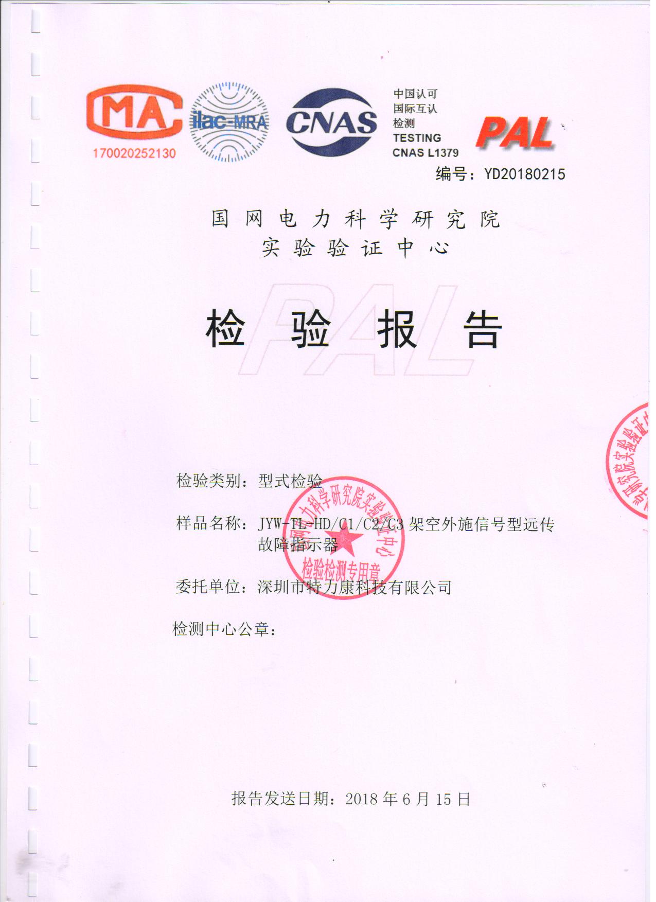 我司專注輸電線路在線監(jiān)測十二年,在智能電網(wǎng)監(jiān)測領(lǐng)域已有了不凡的地位。然而,為了更好的為電力智能化管理做出貢獻(xiàn),我司大力組建研發(fā)團(tuán)隊(duì)致力于配網(wǎng)故障監(jiān)測產(chǎn)品開發(fā),經(jīng)多年研發(fā)與掛網(wǎng)測試,于2018年1月20日,經(jīng)邀請,攜帶我司研發(fā)的架空暫態(tài)特征型、架空信號遠(yuǎn)傳型故障指示器,前往國家電網(wǎng)電力科學(xué)研究院進(jìn)行抽檢試驗(yàn)及測試。在長達(dá)將近5個月的各項(xiàng)性能測試后,我司架空暫態(tài)特征型、架空信號遠(yuǎn)傳型故障指示器的測試結(jié)果均達(dá)到合格。因此,于2018年6月15日國網(wǎng)電力科學(xué)研究院為我司發(fā)放了相關(guān)檢測報告證明文件(型式檢測報告)。