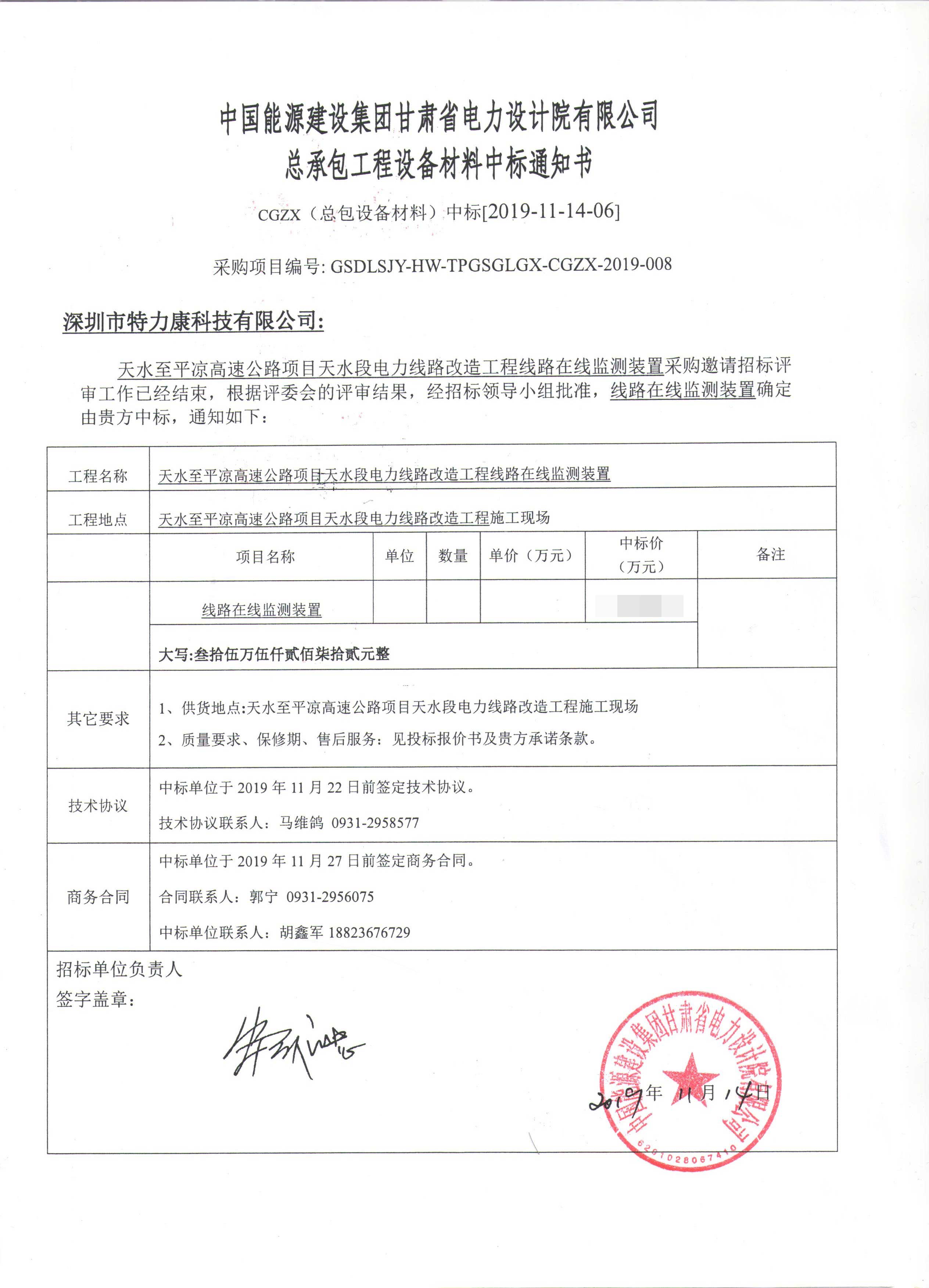 我司中標國網甘肅天水段電力線路改造工程線路在線監測采購項目