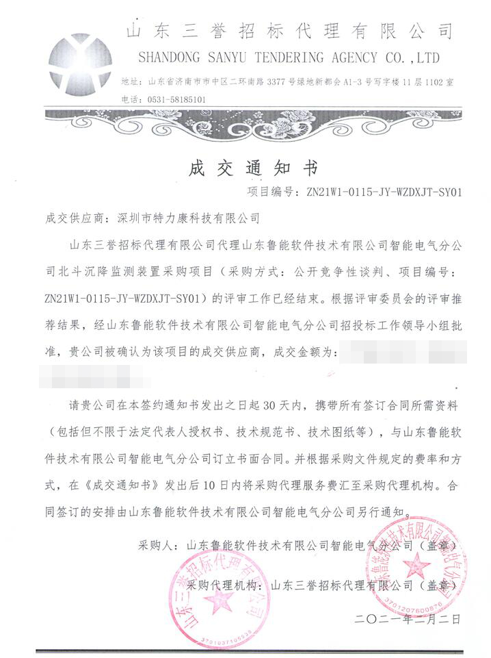 本次山東三譽招標(biāo)代理有限公司代理山東魯能軟件技術(shù)有限公司智能電氣分公司北斗沉降監(jiān)測裝置采購項目(采購方式:公開競爭性談判、項目編號:ZN21W1-0115-JY-WZDXJT-SY01)的評審工作已經(jīng)結(jié)束。根據(jù)評審委員會的評審?fù)扑]結(jié)果,經(jīng)山東魯能軟件技術(shù)有限公司智能電氣分公司招投標(biāo)工作領(lǐng)導(dǎo)小組批準(zhǔn),我司(深圳市特力康科技有限公司)被確認(rèn)為該項目的成交供應(yīng)商,成交通知如下: