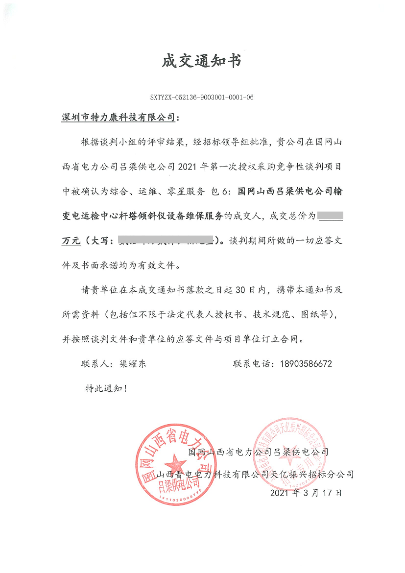 根據談判小組的評審結果,經招標領導組批準,貴公司在國網山西省電力公司呂梁供電公司2021年第一次授權采購競爭性談判項目中被確認為綜合、運維、零星服務包6:國網山西呂梁供電公司輸變電運檢中心桿塔傾斜儀設備維保服務的成交人,成交通知如下: