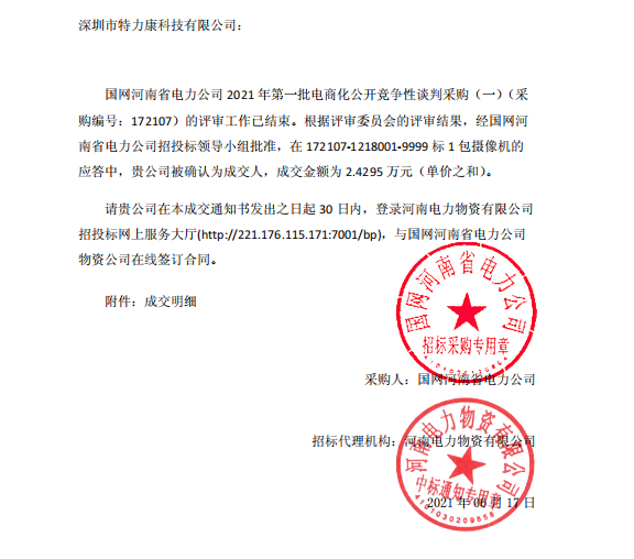 我司(特力康科技)中標國網河南省電力公司2021年第一批電商化公開競爭性談判采購