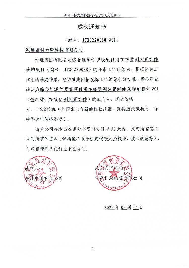 許繼集團有限公司綜合能源竹羅線項目用在線監(jiān)測裝置組件采購項且(編號: JTX6220088)的評審工作已結束。根據(jù)談判工作組的采購結果,經許繼集團招投標工作領導小組批準,貴公司被確認為綜合能源竹羅線項且用在線監(jiān)測裝置組件采購項目包W01(包名稱:在線監(jiān)測裝置組件)的成交人,成交通知如下: